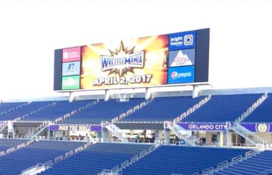 Um fã que mora na Flórida publicou uma foto em seu Twitter oficial onde mostra o logo e a data oficiais da WrestleMania 33 em um telão do estádio do Orlando City. O mega evento será realizado no dia 2 de Abril de 2017 e o logo você confere logo abaixo: